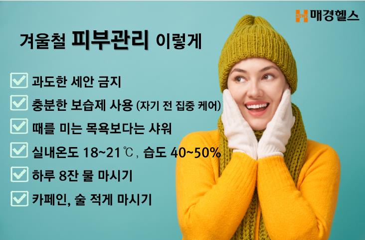 충분한 수분섭취는 사계절 내내 중요하지만 특히 겨울에는 하루 8잔 또는 1리터 이상의 물을 마시도록 하고 피부 각질층은 피부의 가장 바깥층으로 우리 피부의 보호막 역할을 해요. 때를 미는 목욕을 자주하게 되면 각질층이 대부분 제거되어 피부 보호 기능이 떨어져요. 따라서 건조한 겨울철에는 때를 미는 목욕을 너무 자주 하지 않도록 하고, 샤워를 할 때에도 저자극성 약산성 세저를 사용하는 것이 좋아요.