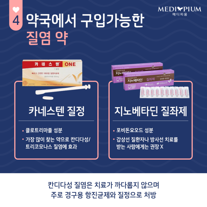경미한 경우에는 국소적으로 바르는 연고나 크림을 사용할 수 있고, 심한 경우에는 경구용 항진균제를 처방받을 수 있어요. 대표적인 약물로는 '카네스텐 질정'과 '지노베타딘 질좌제'가 있어요. 이 약물들은 칸디다증 치료에 효과적이에요.