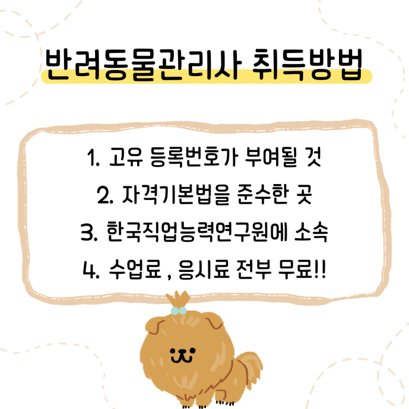반려동물관리사 자격증을 취득하기 위해서는 몇 가지 조건이 있어요. 우선, 고등학교 졸업 이상의 학력이 필요하고, 관련 교육 과정을 이수해야 해요. 또한, 자격증 시험에 응시하기 위해서는 등록번호를 받아야 하며, 한국 고용노동부에 제출해야 해요. 모든 수업과 자격증 취득에 필요한 비용은 무료로 제공된답니다!