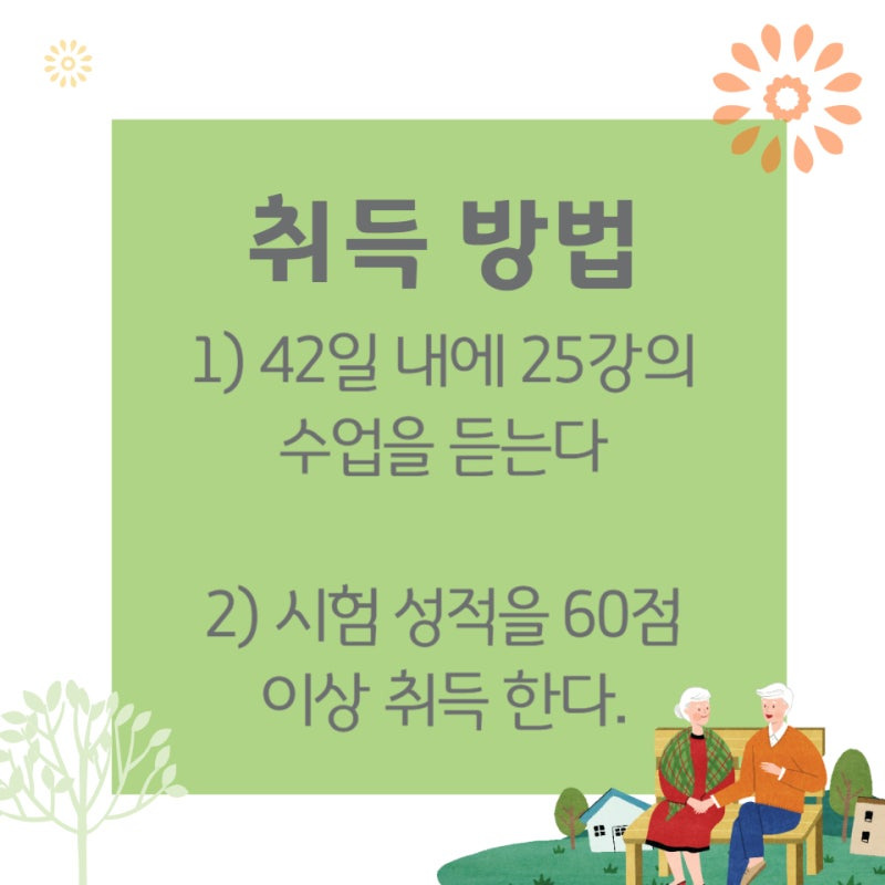 노인심리상담사 자격증 취득을 위해서는 총 42일 동안의 교육 과정과 시험이 필요해요. 이 과정에서 25개의 수업을 이수해야 하고, 최소 60점 이상의 점수를 받아야 시험에 합격할 수 있습니다.