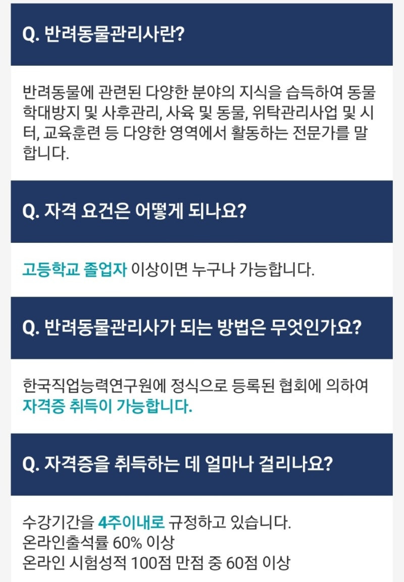 - 지속적인 교육 필요 : 반려동물 관리 분야는 지속적으로 변화하기 때문에, 최신 정보를 습득하기 위한 교육이 필요해요.