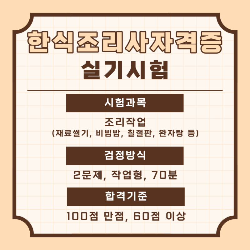 한식조리기능사를 취득하기 위해서는 몇 가지 조건이 있어요. 우선, 필기시험과 실기시험을 모두 통과해야 해요. 필기시험은 한식의 이론과 조리법에 대한 객관식 문제로 구성되어 있고, 실기시험은 실제 요리를 통해 조리 능력을 평가받게 돼요. 필기시험과 실기시험 모두 100점 만점에 60점 이상을 받아야 합격할 수 있어요.
